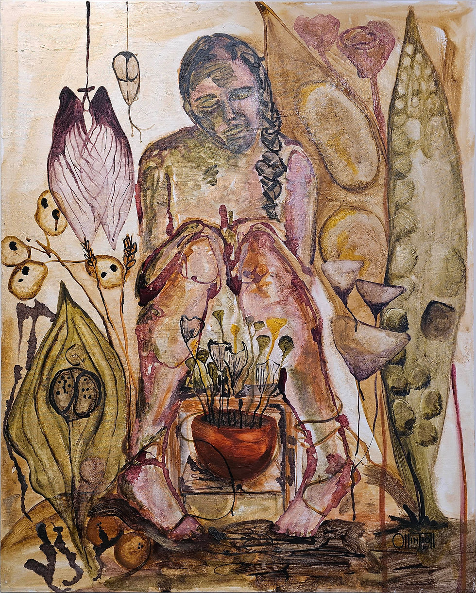 Recurro al arte como un puente hacia la memoria ancestral, un lenguaje en el que las batallas invisibles de las madres a lo largo de la historia se transforman en símbolos, rituales y dinámicas que preservan la sabiduría, la conexión con la naturaleza y los vínculos profundamente humano en nuestra vida actual. El proceso creativo, ligado a los ciclos naturales, se convierte en un testimonio visual de mi propia experiencia materna, plasmando en cada obra la profundidad de este viaje.